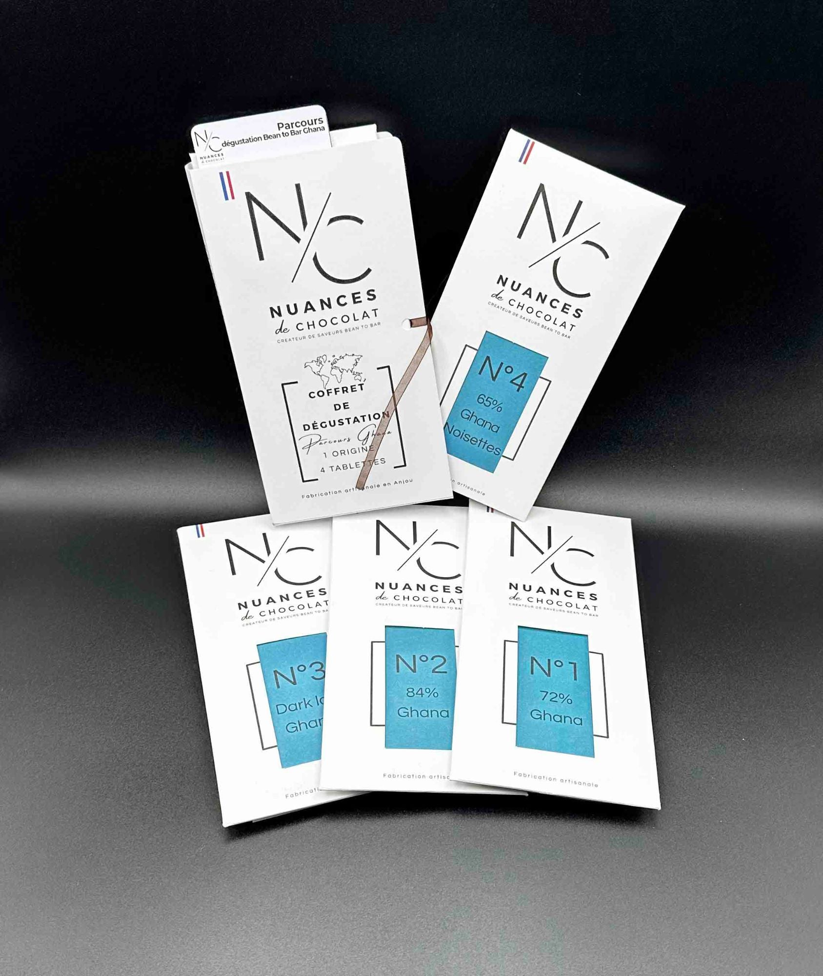 Un Coffret Gourmand, Guidé & Sensoriel : 4 tablettes emblématiques du Ghana, pour explorer toute la diversité aromatique de ce terroir. Marque-page descriptif pour chaque tablette : profils aromatiques, intensité, caractéristiques. Présentation raffinée en livre-tablettes, idéale pour offrir. Ordre de dégustation conseillé pour apprécier la montée en intensité.